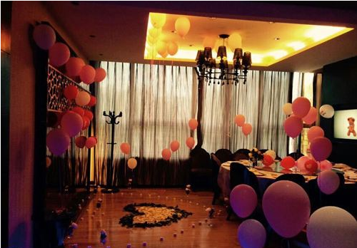 昏黄的灯光下,飘满整个房间的彩色气球,就连桌面上也满是写着l love you的气球,杯子里插满白色粉色玫瑰,地面上是用紫色小灯摆好的大心形,里面是用花瓣和叶子摆成的小心形,一心套一心,像是说男士的心被女士紧紧套住,心心相印,显得格外浪漫。