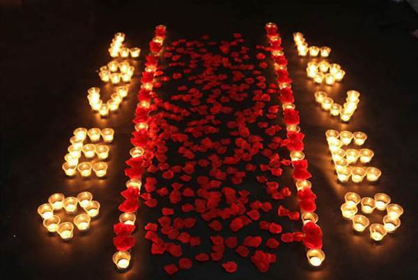 利用蜡烛、照片墙、氢气球布置客厅。普通的燃烧蜡烛不好控制,所以要用可控制的通电蜡烛,蜡烛可以一起亮一起灭。利用挂灯布置成心型,在贴上两人的照片,把女朋友领到漆黑的房间里,让她做好心理准备,倒数321点亮蜡烛,客厅里的布置被一览无余。美丽的鲜花,飘扬的气球,甜蜜的回忆,所有的情感涌上心头,叫她怎么能拒绝你。