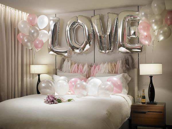 洁白朴素的卧室装修风格,添加上白色+粉红色的气球,淡雅的鲜花,可爱的LOVE字母气球衬托出温馨的感觉。灯光下床头在放一瓶香槟,更显出浪漫的气氛,同样可以体验偶像剧般的浪漫时刻。