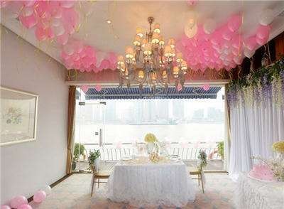 淡粉色的气球彩带挂在天花板上、香槟色玫瑰淡雅脱俗,白色的蜡烛,白色蕾丝质感桌布,金属质感的餐椅靠背上绑上鲜花,墙上用鲜花和白色蕾丝打造出一面田园小清新的感觉,打造梦幻效果。