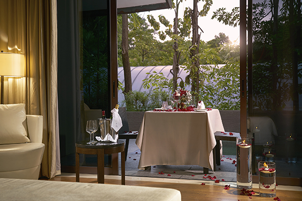 傍晚的阳光风景,昏黄的灯光,餐桌上铺满红色的玫瑰花瓣加上红酒高脚杯,烛台,显得整个气氛格外的高大上。情侣可以在半露阳台上吃个浪漫的晚餐,一起欣赏星空。