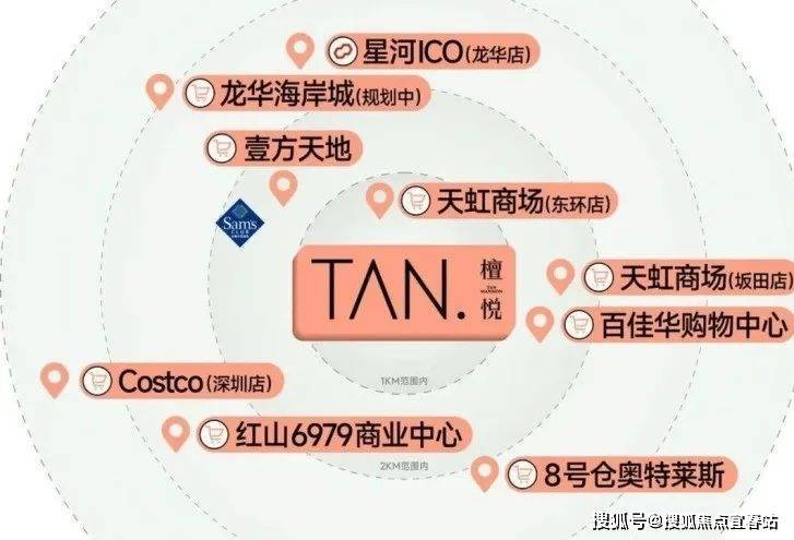 项目自带特色商业街,并且紧邻项目有天虹商场(东环店),距离壹方天地(建面约60万㎡航母级体验式商业集群)约1.5km,周边还有山姆会员店、天虹商场(坂田店)以及Costco会员旗舰店