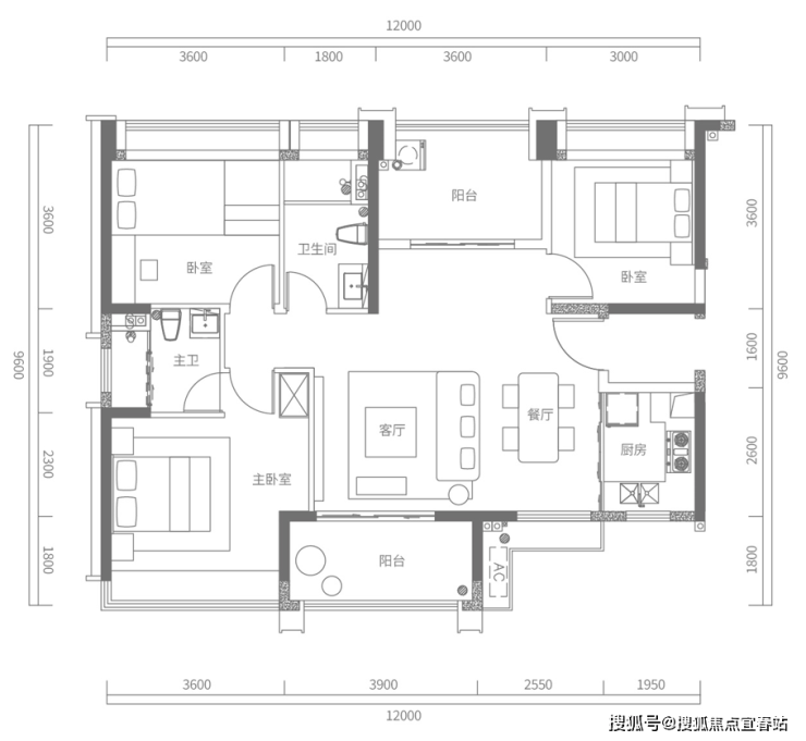 C户型建面约120㎡,3+1房2厅2卫