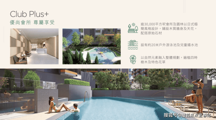 【配套设施方面】:项目设有约30000(约3333㎡)平方呎会所及园林以日式极简风格揉合现代设计,铺设木质墙身及天花,配搭原始石材,选用中性色调的质感布艺、时尚家具、垂饰与木栅,美感与实用兼具,增添柔和气氛,流露轻奢格调。