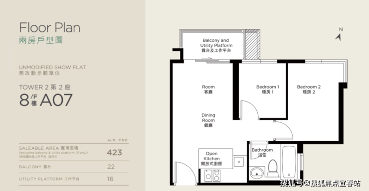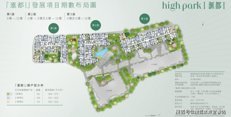 【户型】:项目第一期分为三座发展,共计623伙,各分为A及B座并以一条走廊相连,每层提供16至22伙,不设庇护层,共用三部升降机。户型包括一房至三房户型,主打的两房户型实用面积介乎361(约40㎡)至453(约50㎡)平方呎,而一房户型及三房户型各占约162伙及43伙。一房实用面积介乎284(约31㎡)至373(约41㎡)平方呎;三房实用面积介乎453(约50㎡)至522(约58㎡)平方呎。
