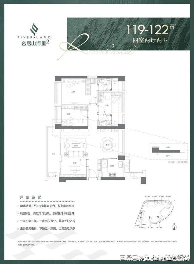 119-122㎡四室两厅两卫(02户型)设计的是竖厅格局,客厅3.5米开间,南北通透,四开间朝南,全屋飘窗,U型厨房,得房率:71.36%(不含赠送),阳台1.5米进深,主朝西南向。