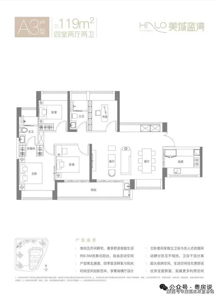 119㎡的4房2厅2卫,A3户型,横厅南北通透格局,客餐厅6.3米开间,LDKB一体化设计,五开间朝南,U型厨房,卫生间干湿分离,客厅连接次卧出6.5米长的观景大阳台约9.75m²,阳台主朝东南向,得房率约75.3%(不含赠送),加上赠送得房率90.48%。(美域蓝湾)官方售楼处电话:400-8651-207,营销中心_tel:400-865-1207,开发商售楼部热线400-865-1207(开发商认证)电话。提前预约看房尊享额外优惠!