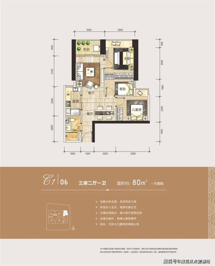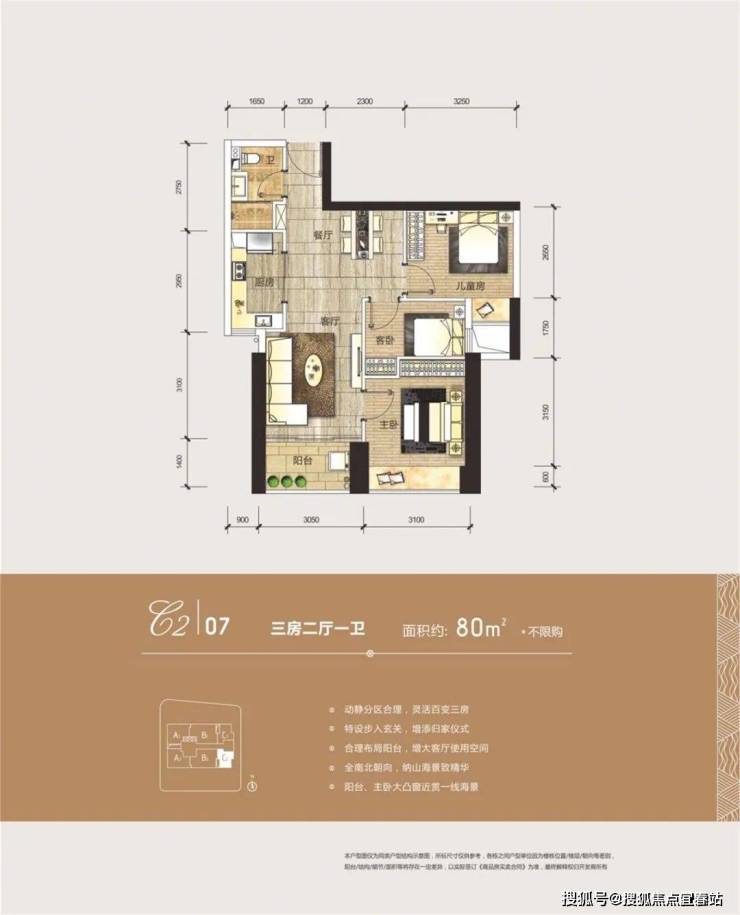 户型:C1/C2:约80㎡三房两厅一卫