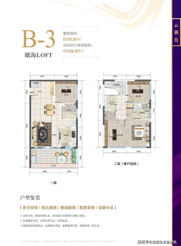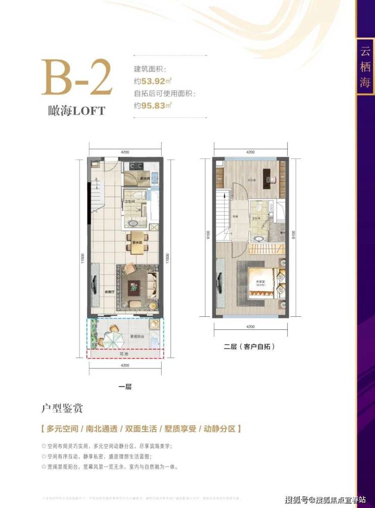 一层繁花,一层繁华;一层价格,两层空间享受。阔绰层高筑就活性多面空间,生活随心所欲;悦享4.2米宽阔景观阳台,室内与自然融为一体,尽享滨海生活美学。