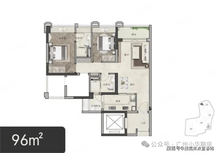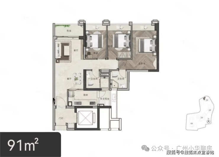 1#靠近万福路,一共有五个户型,分别是91平3房、96平2+1房、120平3+1房和125平3+1房AB两个户型,