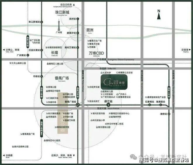 项目地处番禺区府新城,近20家政务单位聚集,办事便捷;周边6大城市级公园(如番禺广场公园)提供生态休闲空间,4大重量级医疗单位(如番禺中心医院)为健康护航,生活配套高端且齐全。