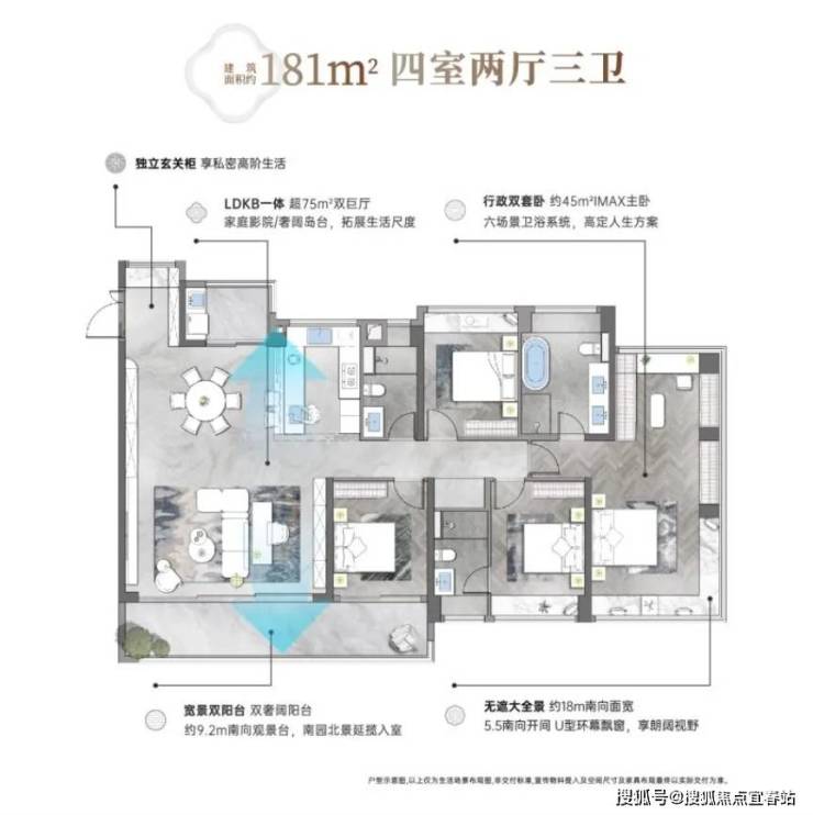 相比起128㎡,181㎡四房的空间配比就显得豪横很多,做到景观、流光、价值最大化,重新定义了东莞180平户型标准。