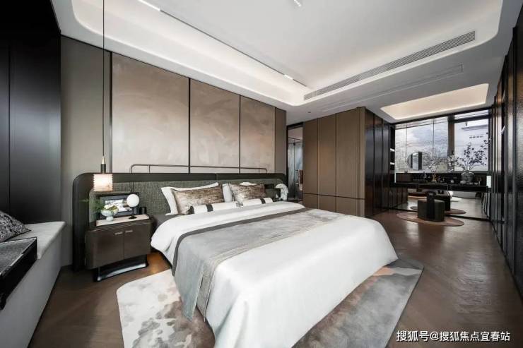Ø U型全面屏主卧:行政主卧面积达40㎡,比普通户型的客厅还大,做到主卫、休息区、衣帽区三条动线互不干扰,约15米的U型全面屏飘窗,一直延伸至衣帽区。