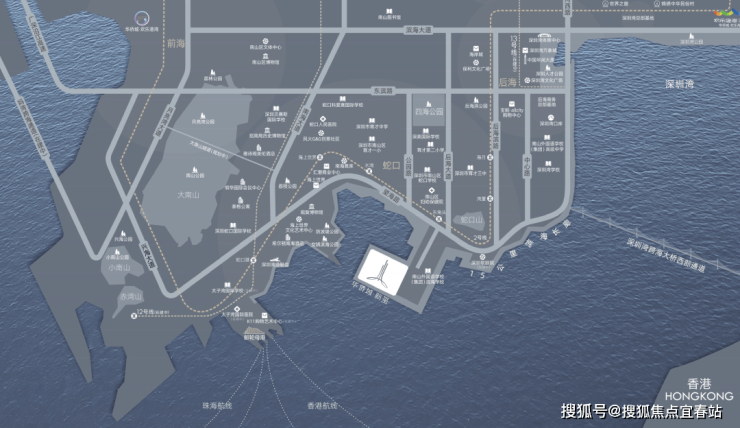 华侨城新玺坐落于深圳市南山区蛇口街道南端,临近东南海玫瑰园三期,南向直面深圳湾,与香港元朗隔海湾相望。此地理位置赋予项目独特海景资源,三面环海,享有270°开阔海景,视野宽广,景色壮美。周边环绕多个公园,如深圳湾公园、女娲滨海公园及四海公园,为居民营造舒适休闲氛围。