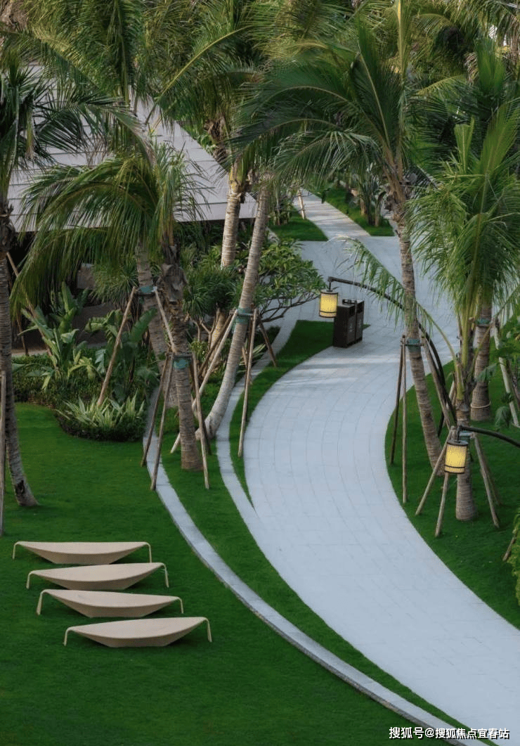 当我们第一次踏足这里的时候,清水湾的绵长沙滩和山海间的情愫深深地吸引着我们,路旁成片的槟榔林与林后的村落给我们留下了很深刻的印象,于是便有了一个隐藏在一片热带棕林背后的住区入口、雨雾弥漫的热带雨林、阳光透过的成片椰林、草阶模仿出海浪等等体现海南当地地域特征的空间设计。