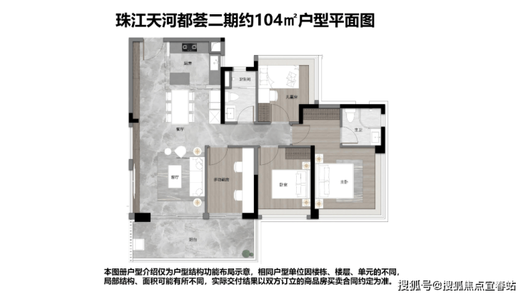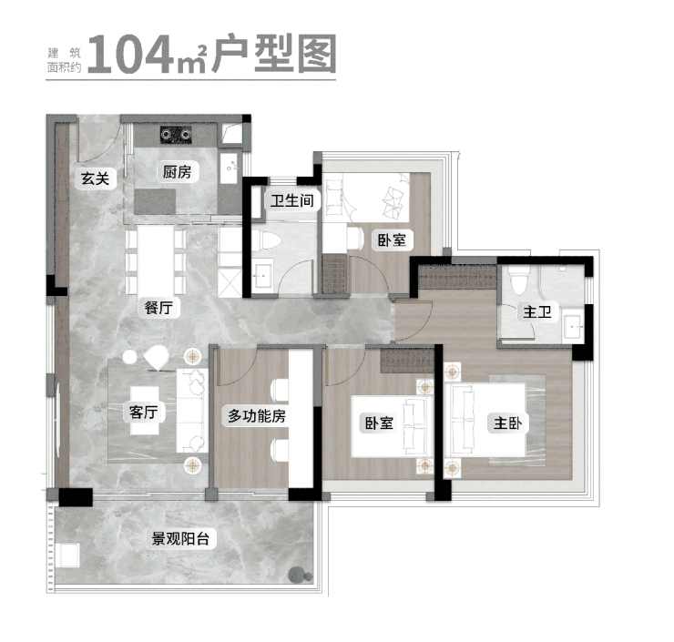 其中,建面约104㎡户型:不仅做到零浪费,更以南向四开间、约14米面宽的设计,让卧室、客厅等所有功能区都能直面阳光。再搭配约6.1米景观阳台,将社区园林风光最大化引入室内,景观无敌。