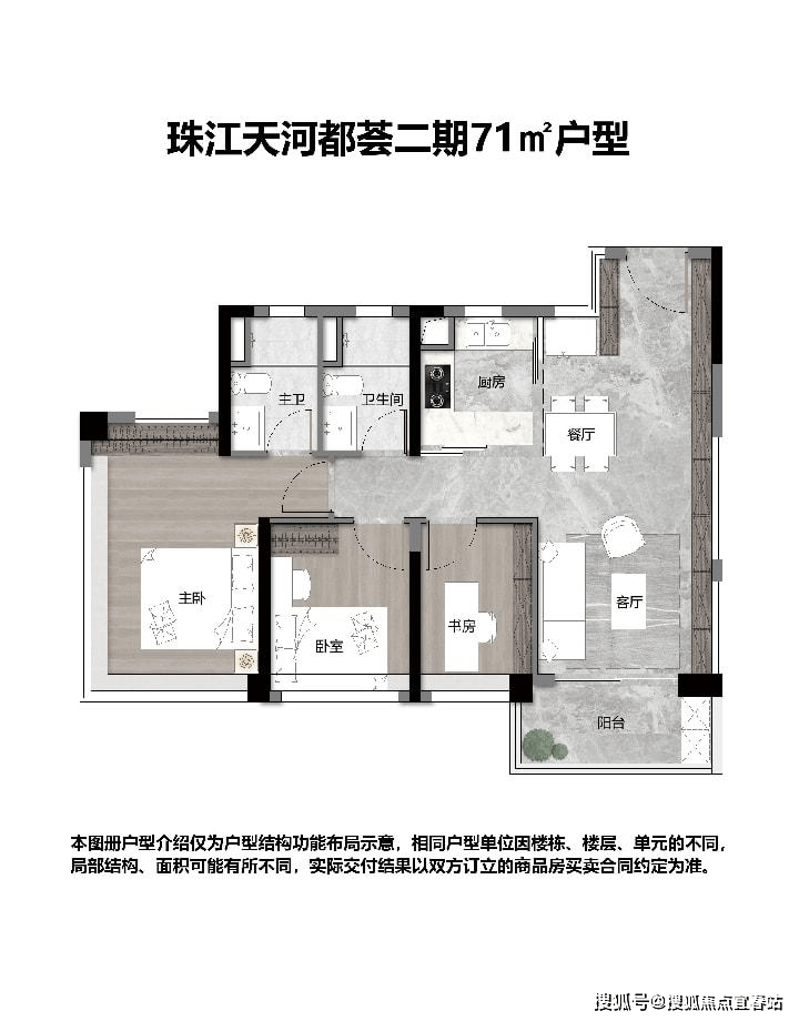 在天河新房普遍500万起步的当下,天河都荟72㎡三房两卫以300万出头的总价成为“刚需福音”。户型采用罕见的四开间朝南设计,阳光可穿透每个房间,主卧270°L型飘窗不仅拓展视野,更可改造为独立书房或婴儿房,实现“小面积大功能”的居住升级。实际使用面积堪比90㎡的空间魔术,让首次置业者告别“牺牲房间换地段”的无奈。