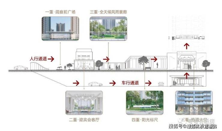 从阔厅前广场,迎宾会客厅,全天候风雨景廊,阳光标尺到格调大堂,打造五重进制礼序归家轴线,让回家的每一步,都是一次煊赫尊贵的品质归心之旅。