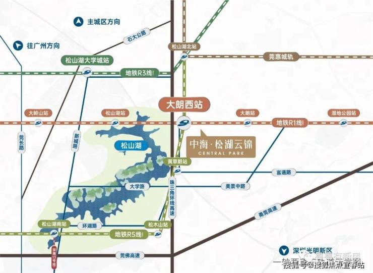 一轴:紧邻松湖东岸主轴松佛路,串联松山湖与主城的必经主干道;