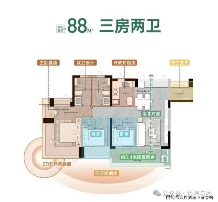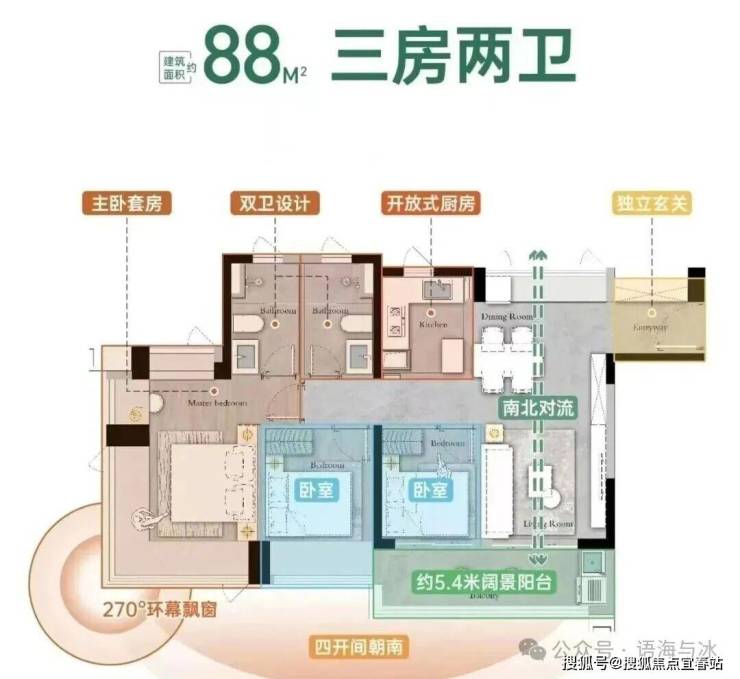 建面88平A2户型,三房两卫,三个卧室加阳台都是南向