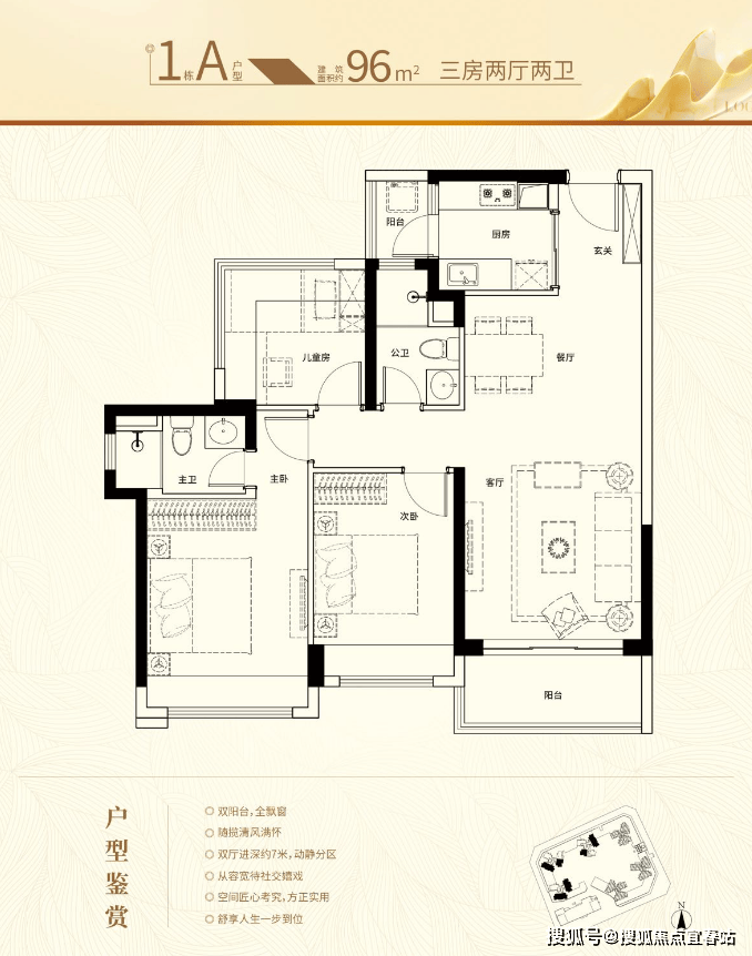 96㎡的3房2卫,设计的传统竖厅格局,有正南向,西南向,东向,东北向