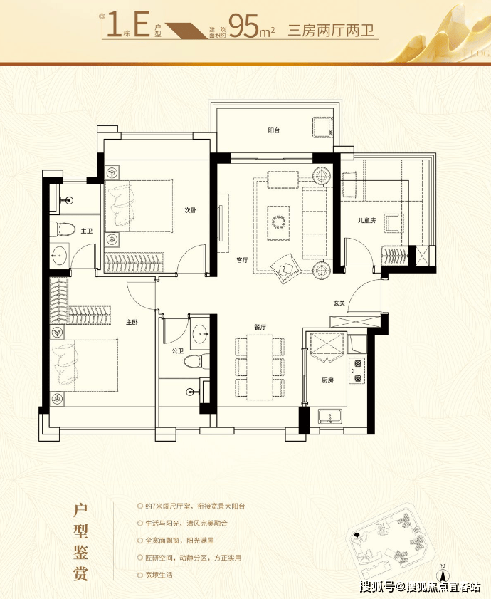 95㎡的3房2卫,设计的南北通透竖厅格局