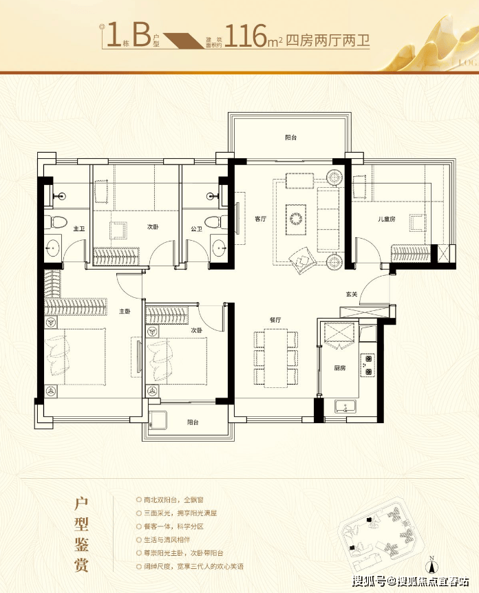 116㎡的4房2卫,设计的是南北通透竖厅格局