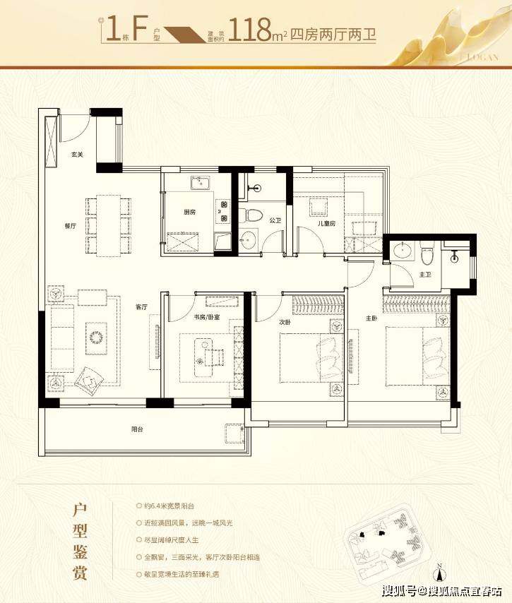 118㎡的4房2卫,设计的是大阳台竖厅格局,有朝南向,朝东向