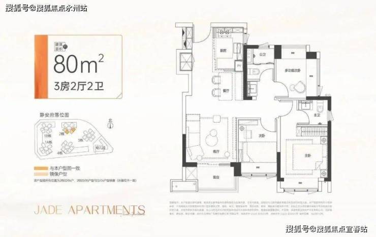 80㎡的3房2厅2卫,设计的是竖厅格局,客厅3.15米开间,S墙设计预留冰箱位,三开间朝南,次卧双飘窗设计,U型厨房,公卫三段式分离设计,得房率74.62%(不含赠送),有西南、东南或西北朝向。