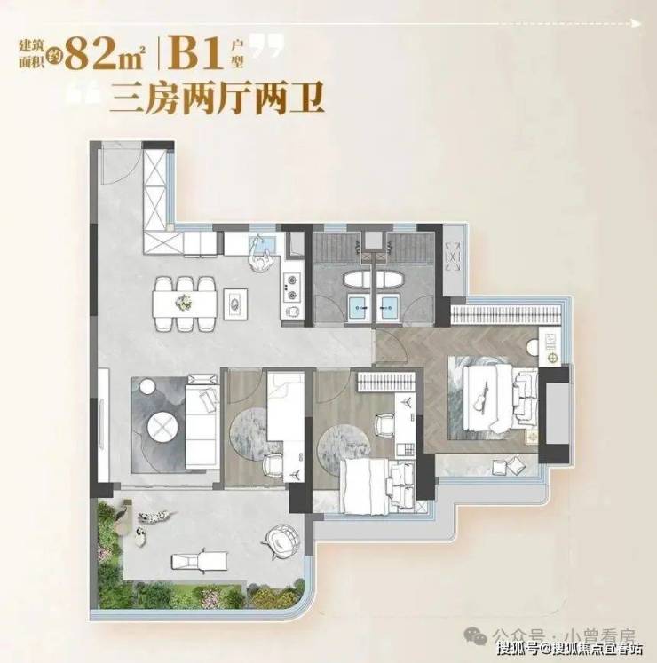 先看 82㎡的紧凑三房,这是很多年轻家庭的首选。进门就是一个 L 型厨房,做饭时转身拿食材很方便,旁边预留了放冰箱的位置。客厅连接着一个 6 米长的阳台,一半算赠送面积,既能晾衣服,也能摆张小桌子喝喝茶。主卧带飘窗,放下 1.8 米的床还有空间打衣柜,另外两个次卧面积也够用,家里有孩子的话,一间做儿童房,一间当书房完全没问题。最惊喜的是赠送的露台和阳台加起来有近 30㎡,相当于花 80 多平米的钱,实际能用的空间接近 130㎡,小户型也能住出大感觉。
