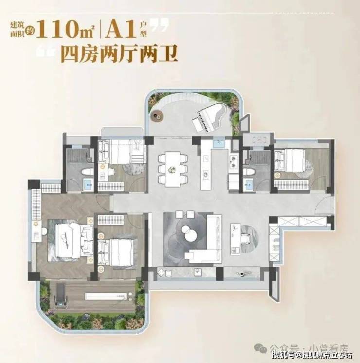 再看 110㎡的四房两厅两卫,特别适合二胎或三孩家庭。一进门有个独立玄关,回家可以随手放钥匙、挂外套,隐私性也不错。客厅和餐厅是竖厅设计,开间 4 米,摆上沙发和餐桌也不挤,周末叫上朋友来家里聚餐都够用。主卧是套房设计,带独立卫生间和衣帽间,早上夫妻两人洗漱不用抢,衣帽间还能放下全家人的衣服。另外三个次卧中,有一个直接连接着 7 米长的景观阳台,采光特别好,可以给老人住或者改造成儿童游乐区。厨房是 U 型布局,洗菜、切菜、炒菜动线合理,旁边还有个生活阳台,平时放洗衣机、晒抹布很方便。