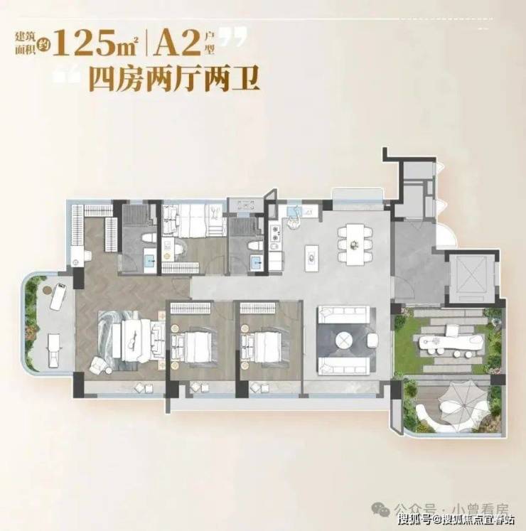 还有 125㎡的大四房,适合想改善居住条件的家庭。这个户型是南北对流的,客厅和餐厅分别对着两个阳台,夏天打开窗户就能穿堂风,连空调都省了。主卧面积超过 20㎡,除了衣帽间和卫生间,还能隔出一个小书房,晚上加班不用去客厅打扰家人。次卧里有一个带飘窗的房间,可以做成老人房,采光好又安静;另外两个房间,一个给孩子,一个做成多功能房,平时可以办公、健身,家里来客人也能当客房。厨房旁边还有个储藏间,平时囤的零食、日用品都能放进去,家里不会显得乱。