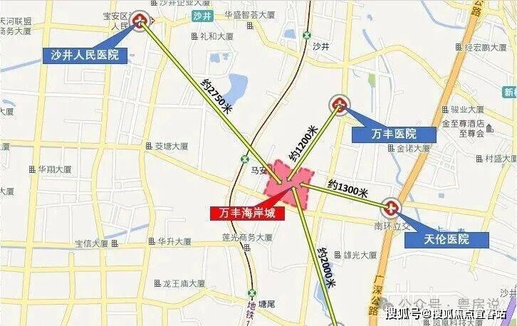 医疗: 项目1公里范围内分布有马鞍山社康,万丰社区社康,除此之外距离项目较近的两所医院是万丰医院和深圳天伦医院,日常小的身体不适可就近就医相对便利。离项目最近的大型公立医院是沙井人民医院,距离项目直线距离约2.75公里,距离稍远,缺少一定便利性,医疗借助交通工具通行。