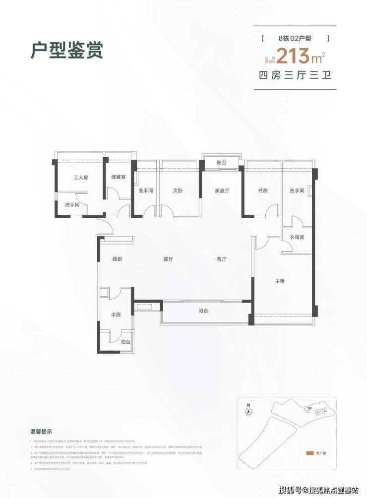 213㎡的4房3厅3卫,设计的是横厅南北通透格局,一梯一户,进门入户玄关,LDKB一体化设计,四开间朝南,双阳台通透,主卧大套间设计,还配有保姆独立套房,中西型多功能厨房,卫生间干湿分离,得房率约82%(不含赠送),阳台主朝东南向。