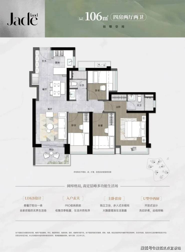 106㎡的4房2厅2卫,设计的是竖厅格局,客厅3.2米开间,LDKB一体化,S墙设计预留冰箱卡槽位,四开间朝南,4个卧室分别做到了3米/2.7米/2.25米/2.2米的宽度,U型厨房,公卫三段式分离设计,有西南或东南朝向。