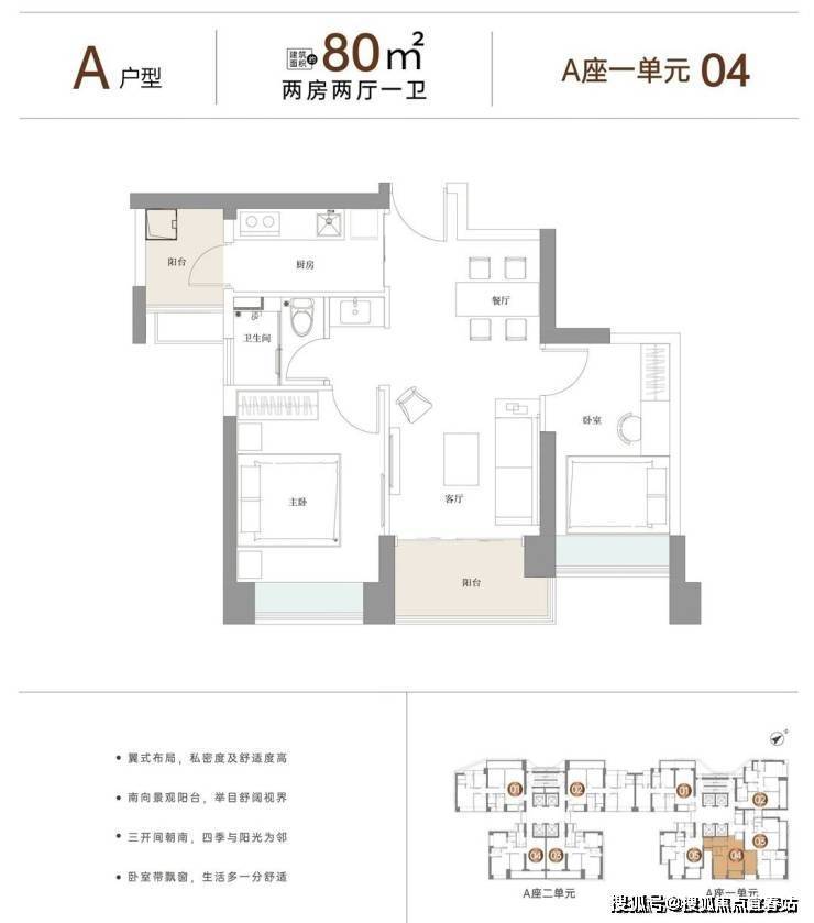 1栋A座一单元四梯五户约80-127㎡2-3房,户型方正·双阳台;