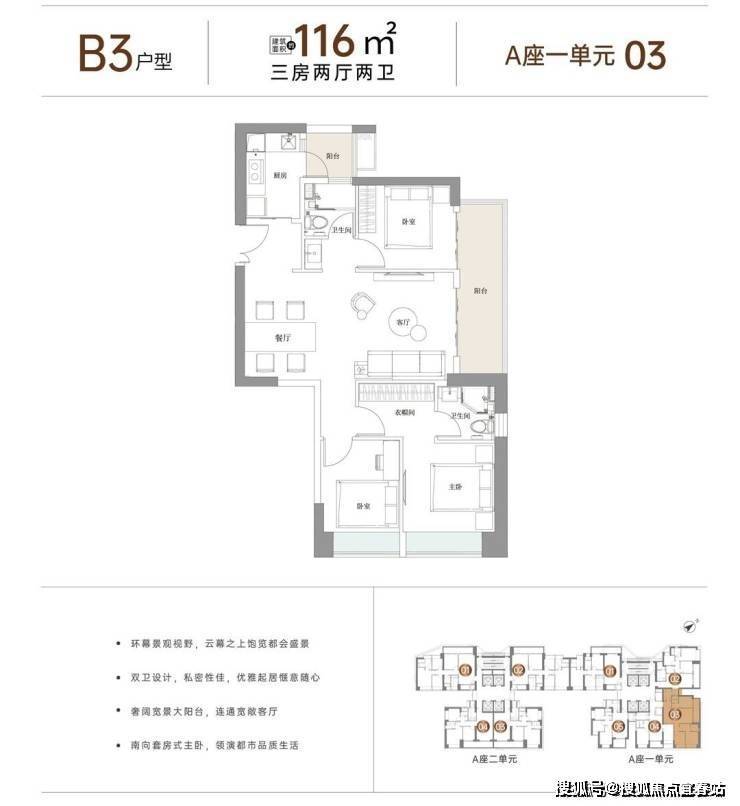 户型面积布局B3116平三房两厅两卫设计的是竖厅格局,客厅3.5米开间,客餐厅一体化,主卧东南向,客厅连接次卧出巨幕大阳台,L型厨房,带1个生活阳台,公卫三段式分离设计,阳台东北朝向。