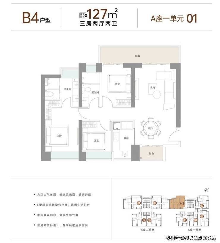 户型面积布局B4127平三房两厅两卫设计的是竖厅格局,客厅4米开间,南北通透双阳台,动静分区,客厅连接次卧出巨幕大阳台,L型厨房,卫生间干湿分离,大阳台主朝西北向。