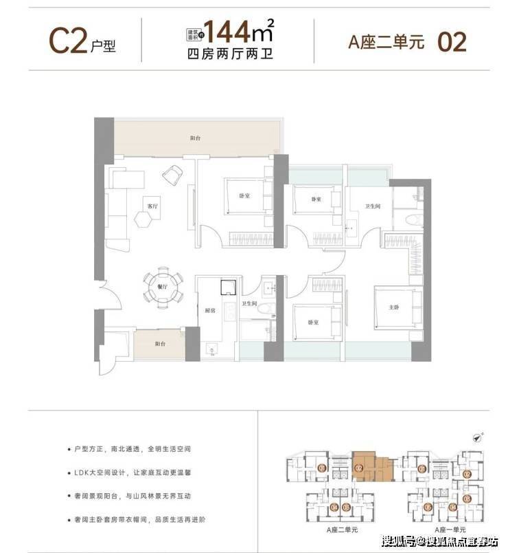1栋A座二单元四梯四户约125-144㎡3-4房,户型方正·超大观景阳台,近一比一梯户比,层高3.15米,中轴之上,做独享者,悦享尊贵生活体验。