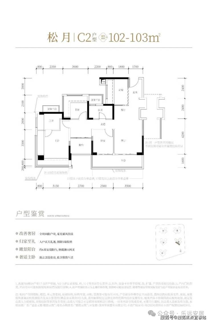 102-103㎡的4房2厅2卫(C1-C2户型),设计的是经典竖厅格局,进门入户玄关,客厅3.5米开间,LDKB一体化,S墙设计预留冰箱卡槽位,动静分区,四开间朝南,4个卧室分别做到了主卧17.98㎡/次卧8.37㎡/次卧8.1m²/次卧7.75㎡(包含墙体飘窗),L型厨房,公卫干湿分离带1个约2m²的设备平台,得房率约81%(不含赠送),客厅连接次卧出9.6m²的观景大阳台,东南或西南朝向。套内面积83.43m²+赠送面积23.86m²=实际使用面积107.29m²,加上赠送后得房率约104.16%。