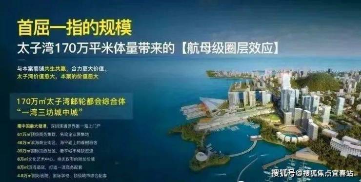 此外还规划有五星级酒店(2座)、国际学校(蛇口共7所)和目前深圳唯一的国际高端康养机构(招商力宝)。太子湾的整体打造将以结合山海资源为基础打造成以国际邮轮母港、高端商务平台、滨海休闲岸线、国际交通枢纽四大功能体系为主的大型城市综合体。