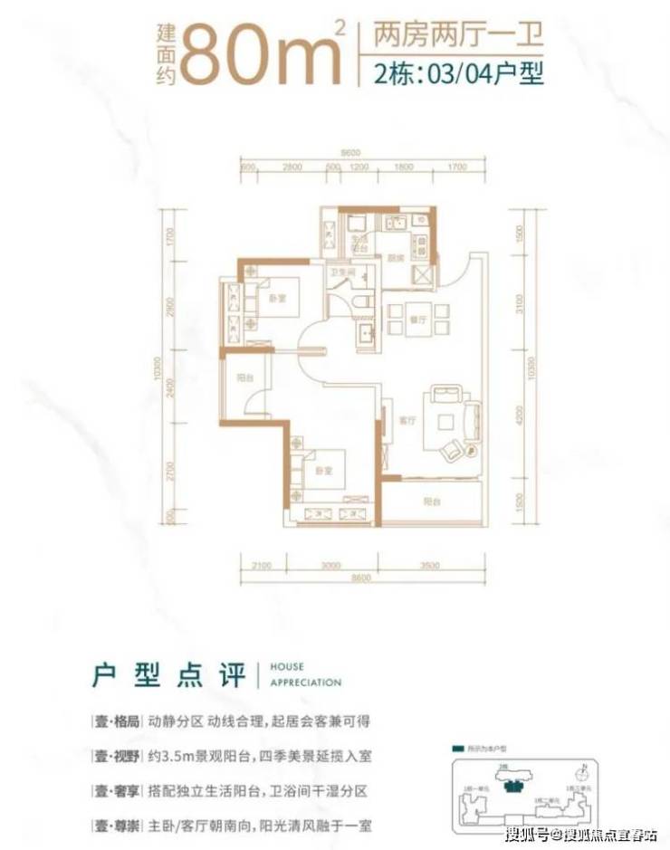 客厅朝南带阳台,主卧朝南,次卧朝西 该户型分布在2栋03,04号房