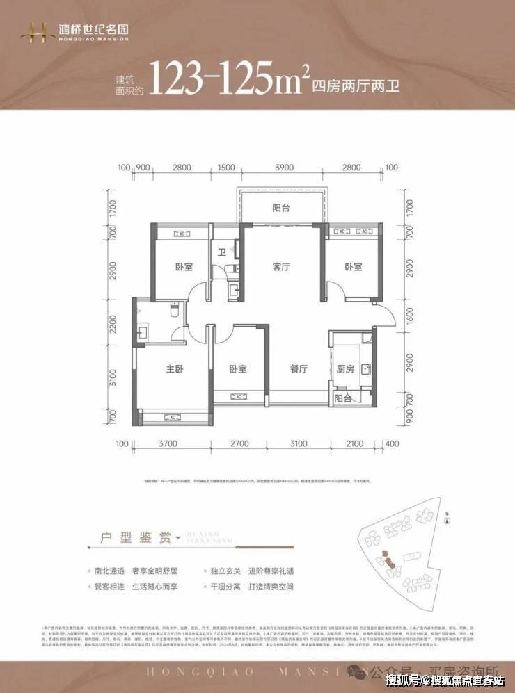 125㎡的4房2厅2卫,设计的是竖厅南北通透格局,客厅3.9米开间,LDKB一体化设计,4个卧室分别做到了3.7米/2.8米/2.8米/2.7米的宽度,L型厨房带1个小生活阳台,公卫三段式分离,阳台主朝东北或东南向。