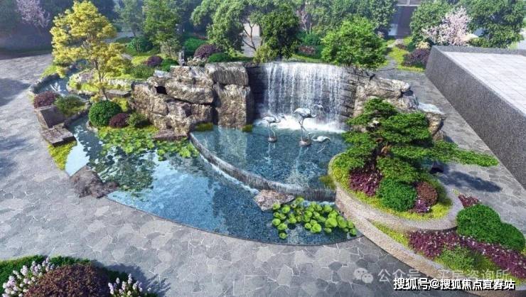 逸趣园林三重水景:提取凤凰山的形态纹理将自然山林元素与现代都市生活有机结合,在有限的面积之中,还原无限的自然山水之趣。