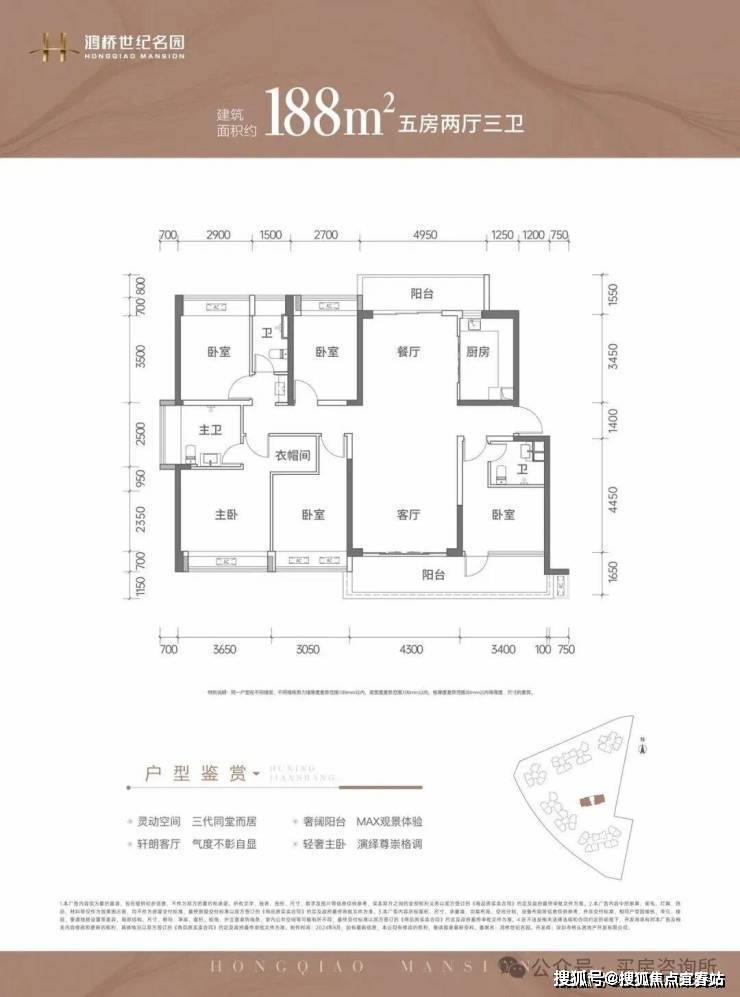 188㎡的5房2厅3卫,设计的是竖格局,南北通透双阳台,客厅4.3米开间,LDKB一体化设计,双主卧套间设计,5个卧室分别做到了3.65米/3.4米/3.05米/2.9米/2.7米的宽度,L型厨房带1个小生活阳台,公卫三段式分离,客厅阳台连接次卧出7.7米长的大阳台,主朝正南向。