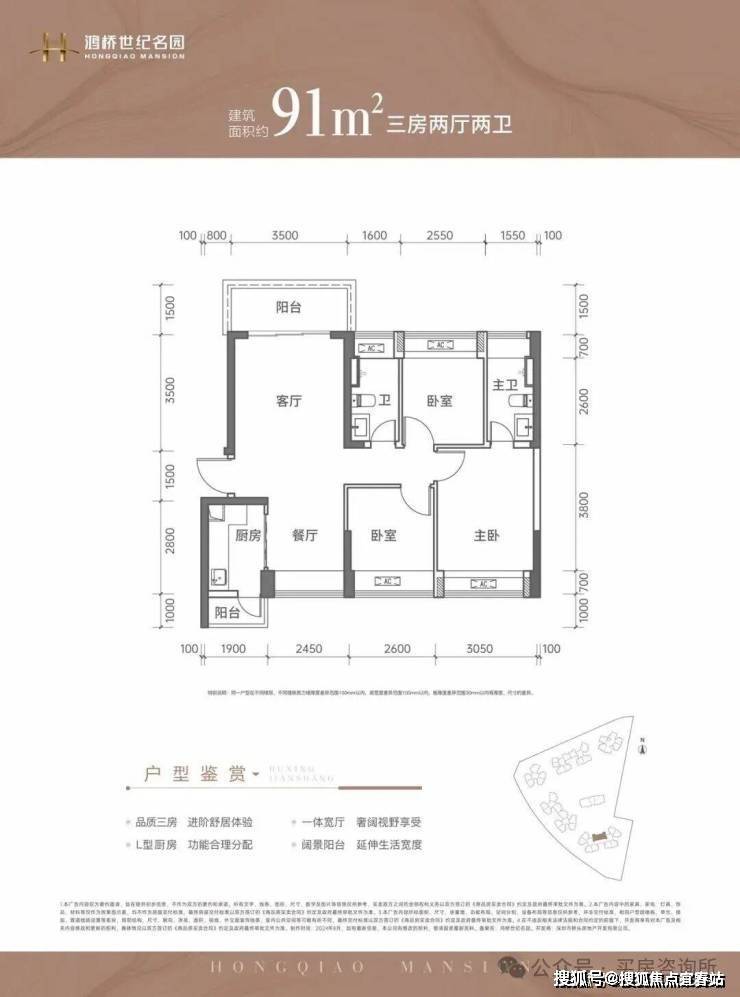 91㎡的3房2厅2卫,设计的是竖厅南北通透格局,客厅3.5米开间,LDKB一体化设计,3个卧室分别做到了3.05米/2.6米/2.55米的宽度,L型厨房带1个小生活阳台,卫生间干湿分离,阳台主朝正北向。