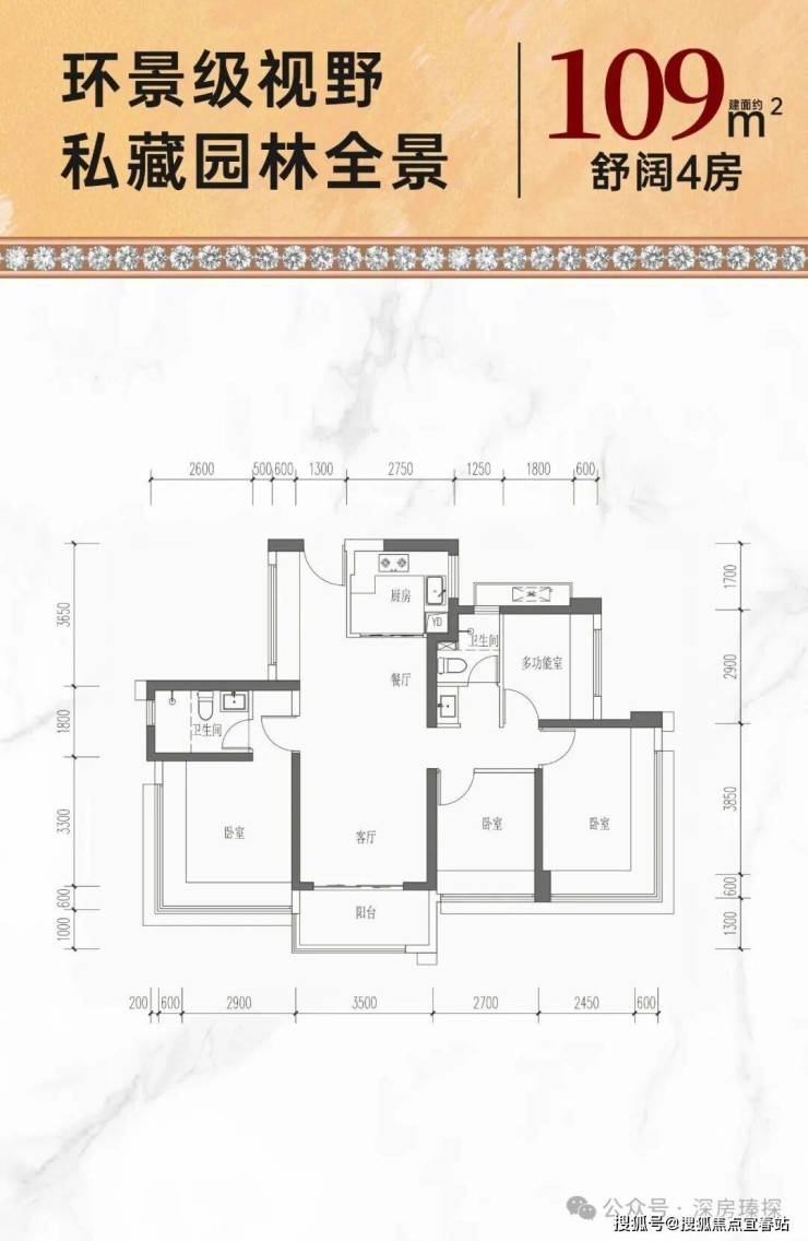 109㎡的4房2厅2卫,设计的是竖厅双龙抱珠格局,进门入户玄关,客厅3.5米开间,LDKB一体化,主卧270°无柱转角飘窗,分别做到了主卧15.45㎡/次卧13.57㎡/次卧9.31㎡/次卧6.96m²(包含墙体飘窗),U型厨房,公卫三段式干湿分离,得房率约74%(不含赠送),阳台西南朝向约5.95平。套内面积80.81㎡+赠送面积16.75㎡=实得面积97.56㎡,加上赠送后得房率约89.34%。
