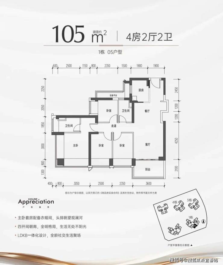 本批次产品中最大面积户型,位于1栋,东南朝向最前排,一共两条腿。观景阳台约2.1米宽,加上三个卧室一共四开间推窗即是观澜河、碧道公园、大布巷历史文化公园景观,视野开阔无遮挡,居住感受好。