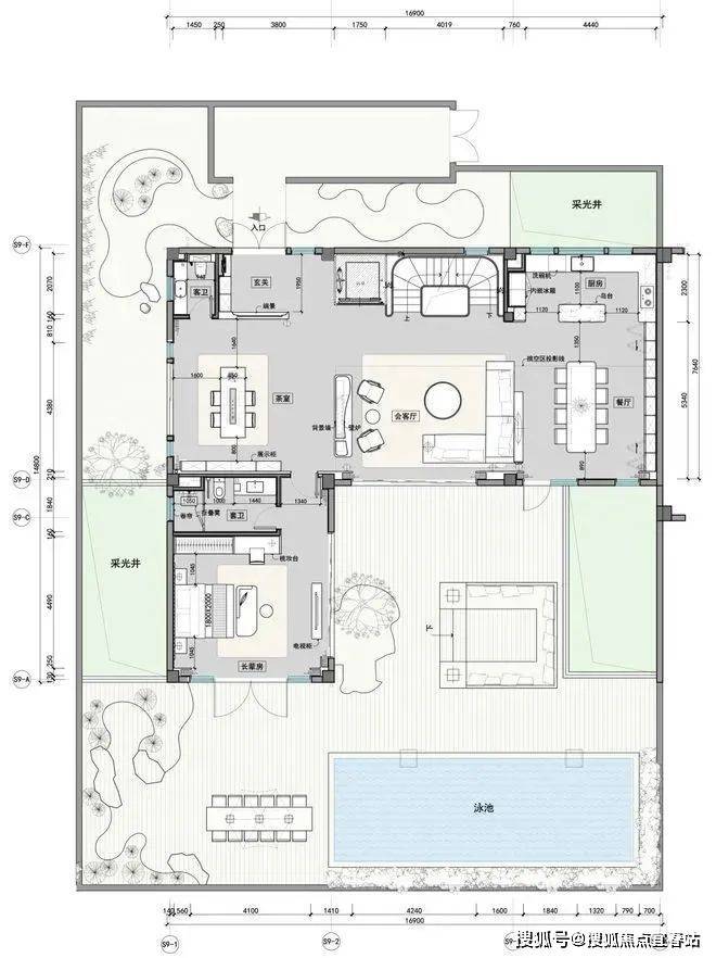 约 173㎡的空间里,布局 5 房 4 厅 7 卫、2 保姆房、2 车位与庭院泳池,使用面积在 920m² - 1410m²。一层客厅与餐厅畅连庭院,泳池景观尽收眼底,长辈房与客卫贴心设计;