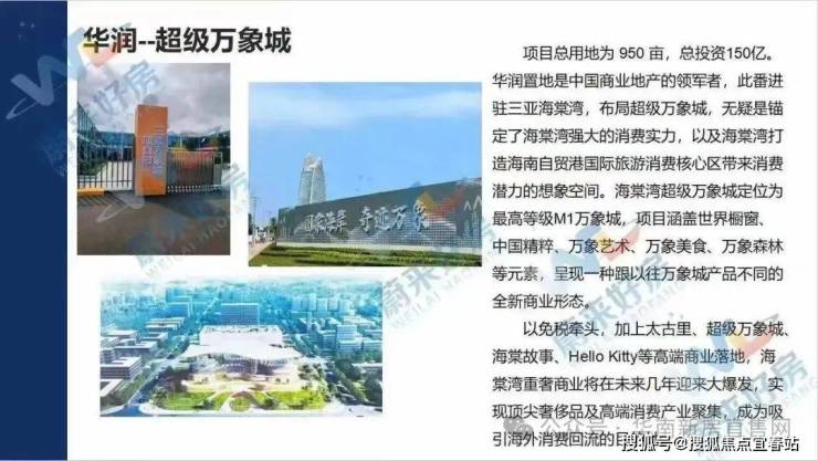 🏖海洋欢乐世界(国家4A级景区,占地约2000亩)、凯悦酒店、黎安海归小镇、免税购物城(规划中)、体育竞猜中心(规划中)等。
